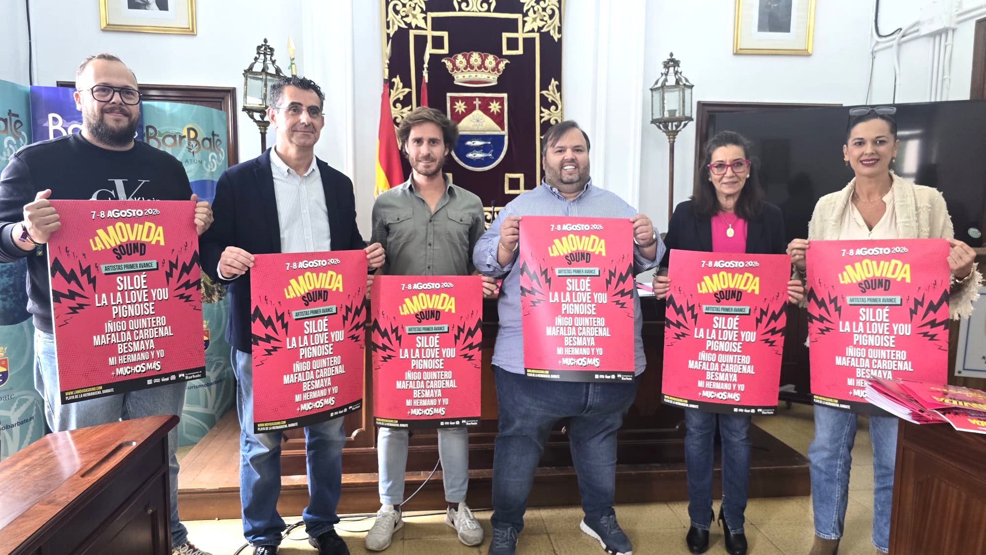 El Salón de Plenos del Ayuntamiento de Barbate ha acogido hoy la presentación de la segunda edición de La Movida Sound. El alcalde, Miguel Molina, la primera teniente de alcalde, Ana Moreno, el delegado de Turismo, Paco Ponce, y la edil de Cultura, Ana Valencia; junto a José Luis Iravedra, CEO de Disparate Entertainment y a Nacho Gurrea, CMO de Grupo Ban Ban; han ofrecido una rueda de prensa para dar los detalles del festival.