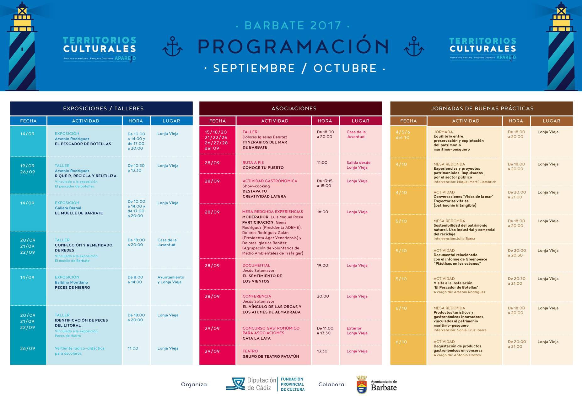 El programa que se desarrollará hasta la primera semana de octubre incluye exposiciones, talleres, encuentros con asociaciones, rutas, show cookings, mesas redondas, documentales y jornadas de buenas prácticas. Barbate alberga espacios naturales de gran valor, parques, parajes y reservas, playas, acantilados y salinas que deben ser cuidados y protegidos de agresiones externas. El medio natural es la base de la cultura y su buen estado garantiza la permanencia de los recursos, el bienestar de las comunidades y la continuidad de su patrimonio. Se impone la necesidad de que la pesca sea sostenible y proteja el medio ambiente.