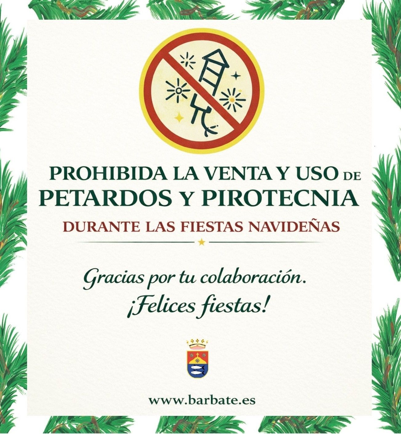 El Ayuntamiento de Barbate ha emitido un bando municipal por el que se prohíbe la venta y utilización de petardos y artículos pirotécnicos en todo el término municipal durante las fiestas navideñas, salvo aquellos casos que cuenten con la expresa autorización municipal y de las administraciones públicas competentes.