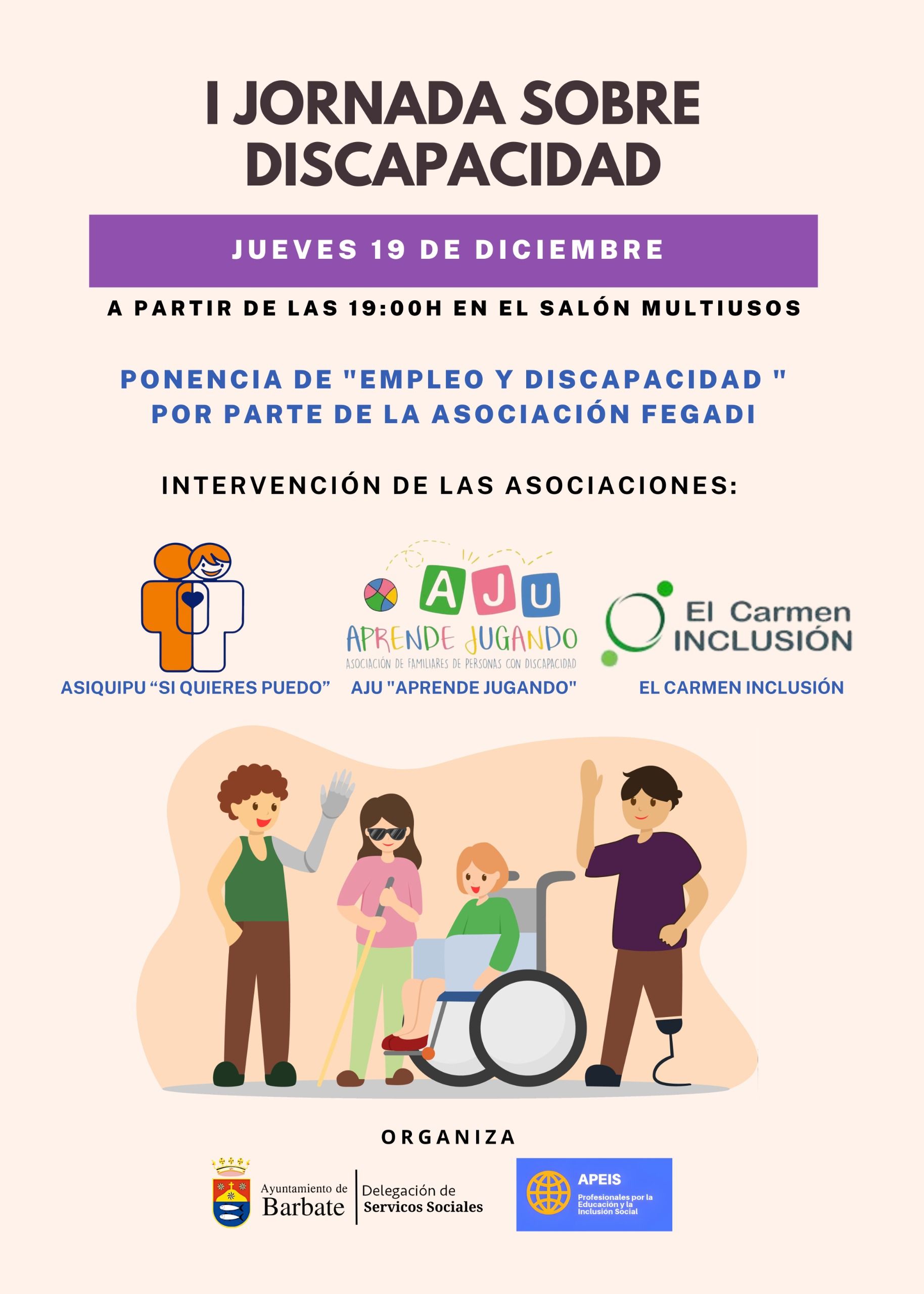La Delegación de Servicios Sociales del Ayuntamiento de Barbate organiza la I Jornada sobre Discapacidad, que tendrá lugar el próximo jueves 19 de diciembre, a las 19:00 horas, en el Salón Multiusos.