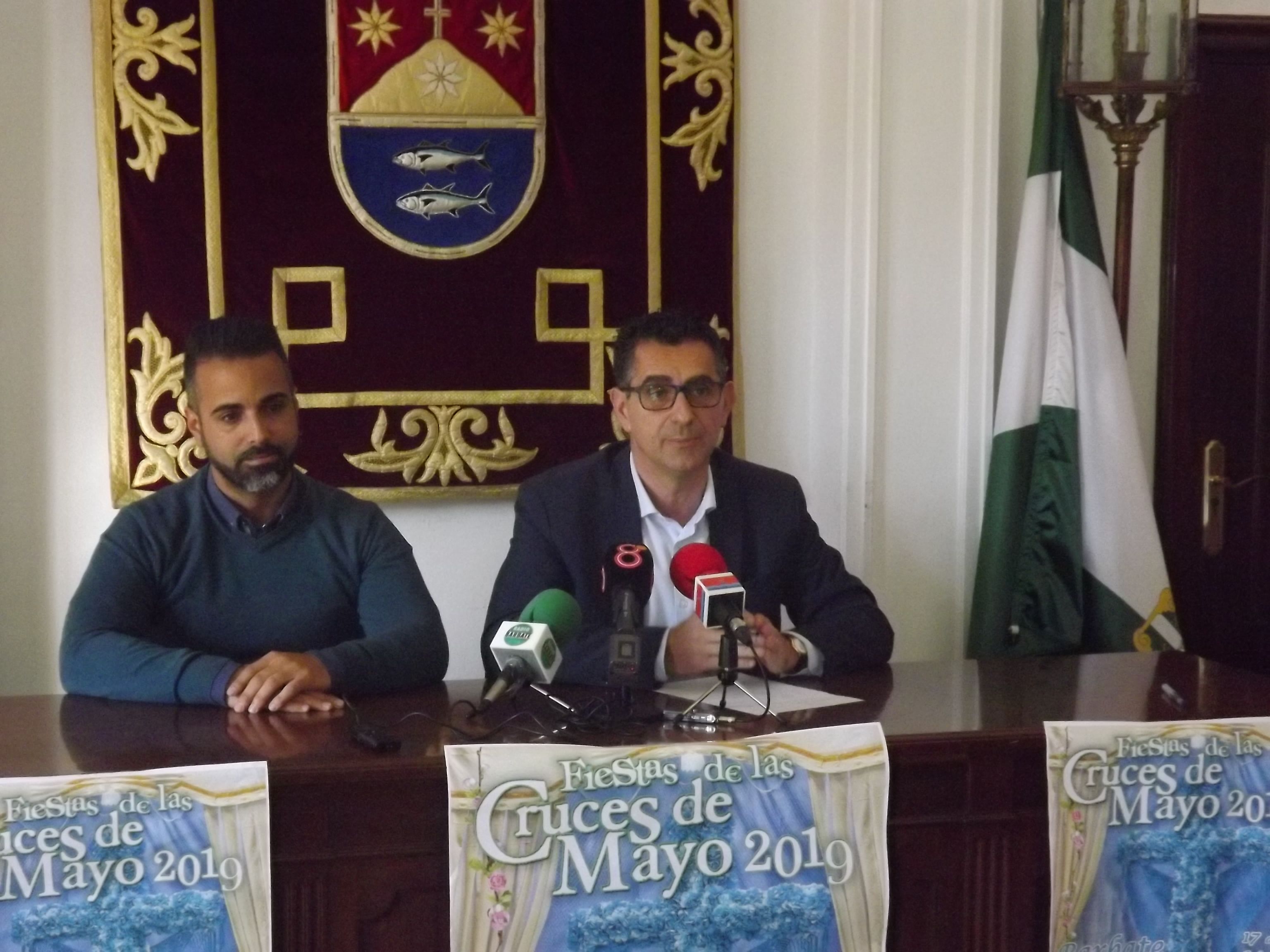 El alcalde de Barbate, Miguel Molina, junto con el Delegado de Fiestas, Juan Miguel Muñoz, han presentado esta mañana, en el salón de actos del ayuntamiento, el cartel del III concurso “Cruces de Mayo”.