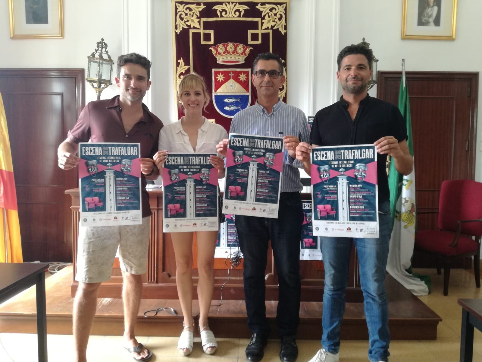 La puesta de sol en el Faro de Trafalgar será el mejor escenario para la primera edición del Festival Internacional de Artes Escénicas ‘Escena Trafalgar’, que se celebrará entre el 14 y el 16 de septiembre en este lugar mágico. El evento ha sido presentado hoy por parte del alcalde de Barbate, Miguel Molina; el delegado de Cultura, Sergio Román, y el organizador, Yeyo Guerrero. El acto también ha contado con la presencia de la actriz Maggie Civantos, conocida para el gran público por sus papeles en las aclamadas series ‘Vis a Vis’ y ‘Las chicas del cable’.