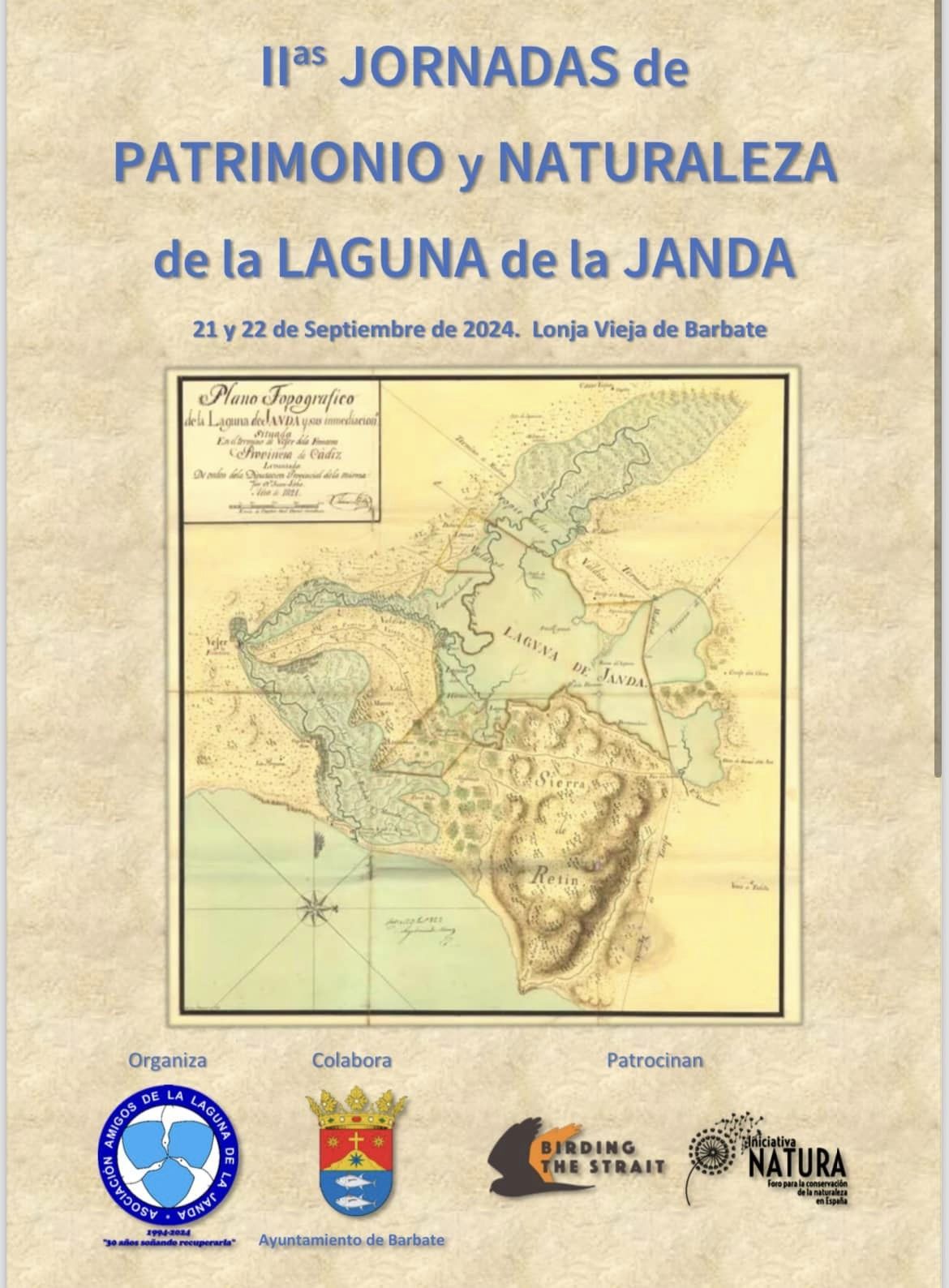 La Delegación Municipal de Medio Ambiente del Ayuntamiento de Barbate, junto con la Asociación Amigos de la Laguna de la Janda, celebran las II Jornadas de Patrimonio y Naturaleza de la Laguna de la Janda, los días 21 y 22 de septiembre en la Lonja Vieja de Barbate.