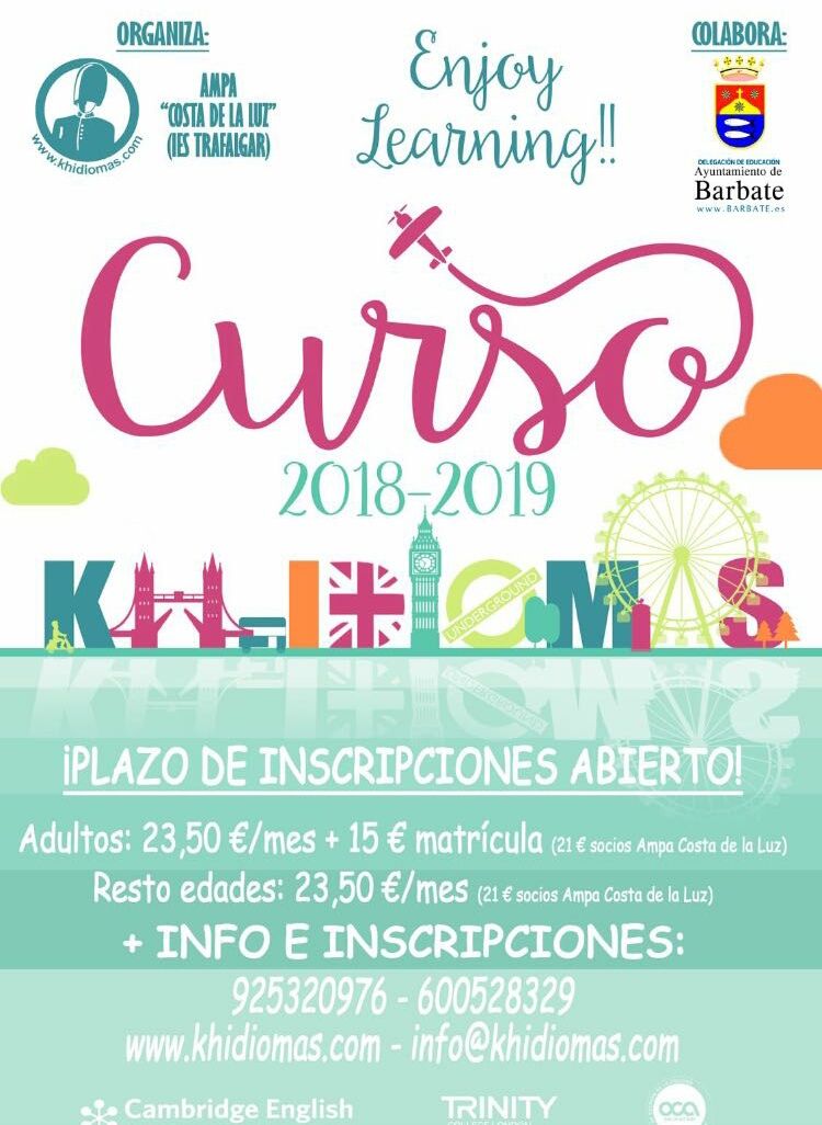 La Delegación de Educación del Ayuntamiento de Barbate, que dirige la concejala Ana Pérez, colabora un año más en el Curso de Idiomas organizado por KH Idiomas y el AMPA Costa de la Luz del IES Trafalgar. Esta actividad durará todo el periodo escolar, como ya se viene desarrollando en años anteriores, en grupos tanto para adultos como niños. Las clases se realizarán en horario de tarde en las aulas del IES Trafalgar.