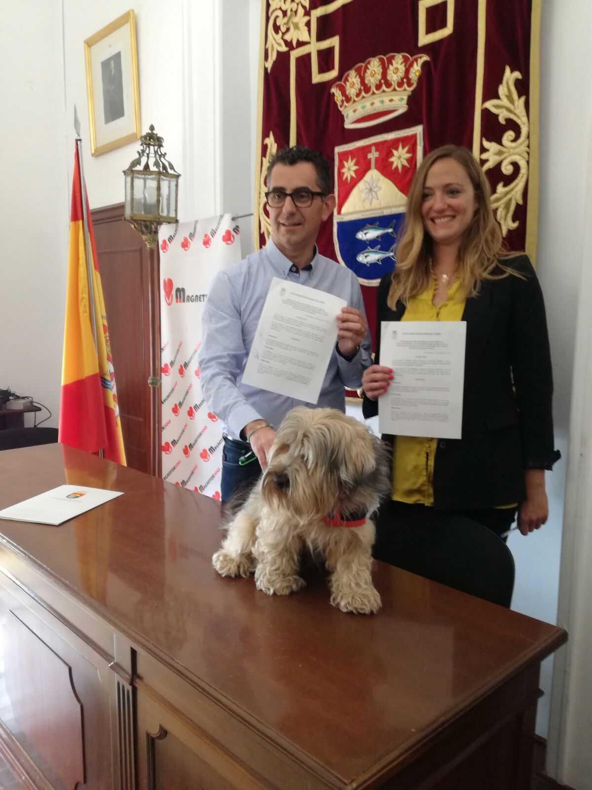 El Ayuntamiento de Barbate ha realizado un protocolo de colaboración con la Asociación Internacional de Perros de Ayuda Social ‘Magnetizadogs’, con el fin de prestar asistencia a personas con necesidades especiales a través de terapias con perros entrenados especialmente para facilitar la comunicación. El documento ha sido firmado hoy en el Salón de Plenos por parte del alcalde de Barbate, Miguel Molina, y la presidenta de la entidad, Ana Pedregosa, bajo la atenta mirada del pequeño Pitu, uno de los perros de la asociación.