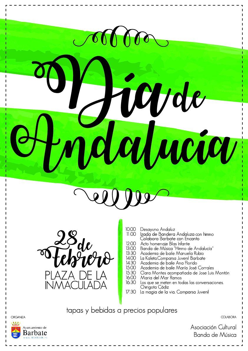 Barbate celebrará el Día de Andalucía el próximo miércoles, 28 de febrero, con una jornada festiva que se desarrollará en la Plaza de la Inmaculada. Los actos comenzarán a las 10.00 horas con un desayuno andaluz, al que seguirá la izada de la bandera de Andalucía en la rotonda de entrada a la localidad, lugar que actualmente preside esta insignia. Esta actividad cuenta con la colaboración de la asociación ‘Por un Barbate con encanto’.