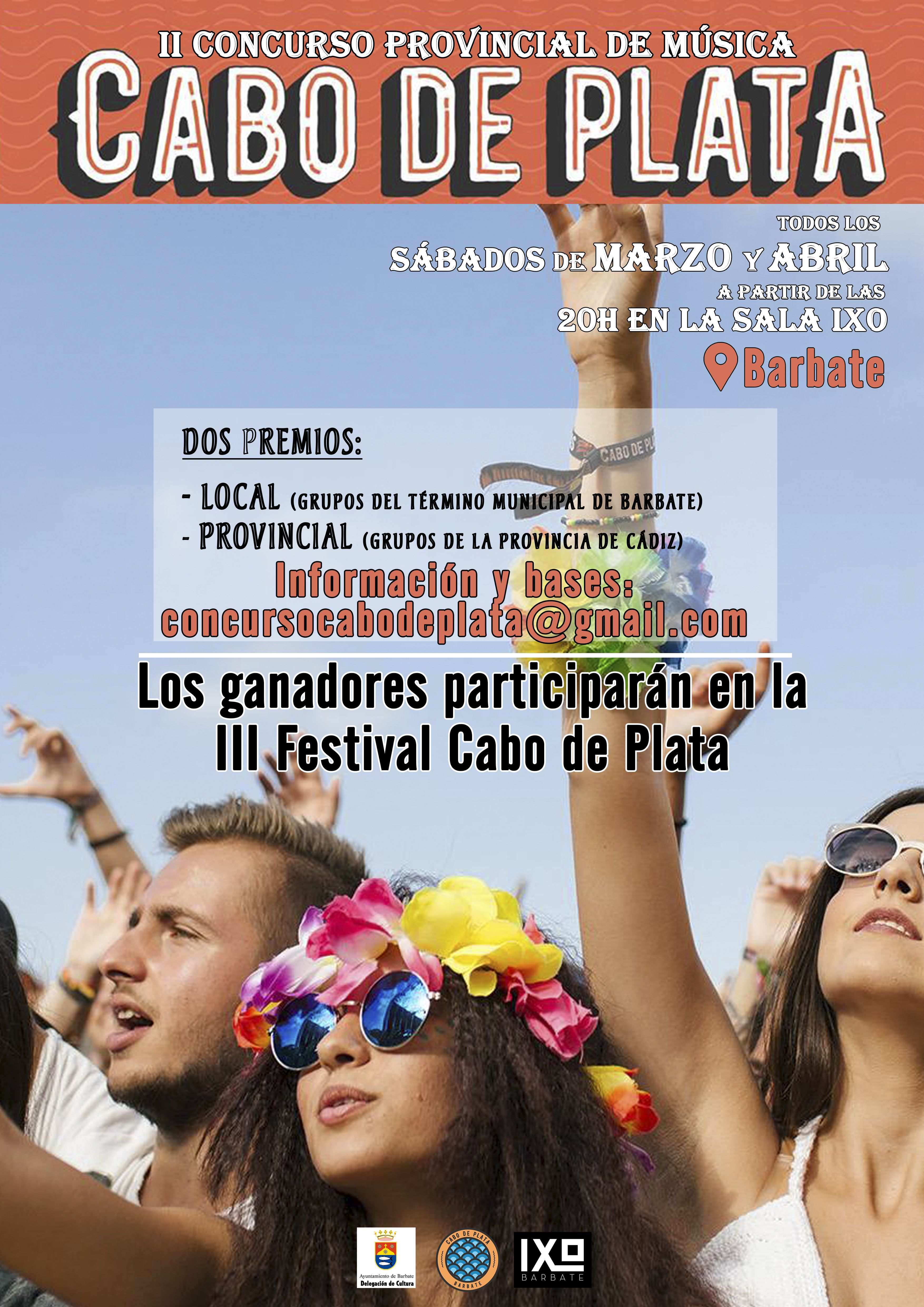 La Delegación Municipal de Cultura, que encabeza el concejal Sergio Román, la organización del Festival Cabo de Plata y Sala Ixo han convocado la segunda edición del concurso para bandas y grupos ‘Cabo de Plata’, que este año, como novedad, tendrá carácter provincial. El certamen se celebrará todos los sábados entre el 10 y el 5 de mayo en la Sala Ixo y podrán concurrir un total de 16 bandas o grupos musicales. Los ganadores tendrán como premio formar parte del cartel oficial de la tercera edición del Festival Cabo de Plata, que tendrá lugar en la localidad los días 5, 6 y 7 de julio, donde podrán ofrecer un concierto de una duración aproximada de 40 minutos en alguna de las jornadas festivaleras establecidas por la organización.