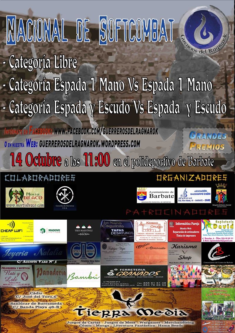 La Asociación Guerreros del Ragnarok, delegación municipal de Juventud y Deportes del Ayuntamiento de Barbate junto con la Asociación Baessippo 2000 y la colaboración de las asociaciones Mortis Draco y Concilio de Herreros F.E.S., traerán al pabellón cubierto del Polideportivo Municipal el I Torneo Nacional de Softcombat el próximo día 14 a partir de las 11h de la mañana, donde se darán cita más de cuatrocientas personas dispuestas a competir en un torneo que cada año tiene más adeptos y cuyos colectivos aspiran a convertirlo en deporte.