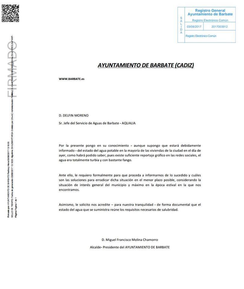 El equipo de Gobierno en el Ayuntamiento de Barbate ha pedido a la empresa concesionaria del servicio de aguas, Aqualia, explicaciones por los hechos ocurridos durante los últimos días en la mayoría de viviendas de la localidad, en las que el agua potable salía totalmente turbia y con fango. Fueron los propios vecinos quienes pusieron en conocimiento del Ayuntamiento estas circunstancias, a través de las numerosas imágenes que se pueden ver en las redes sociales.