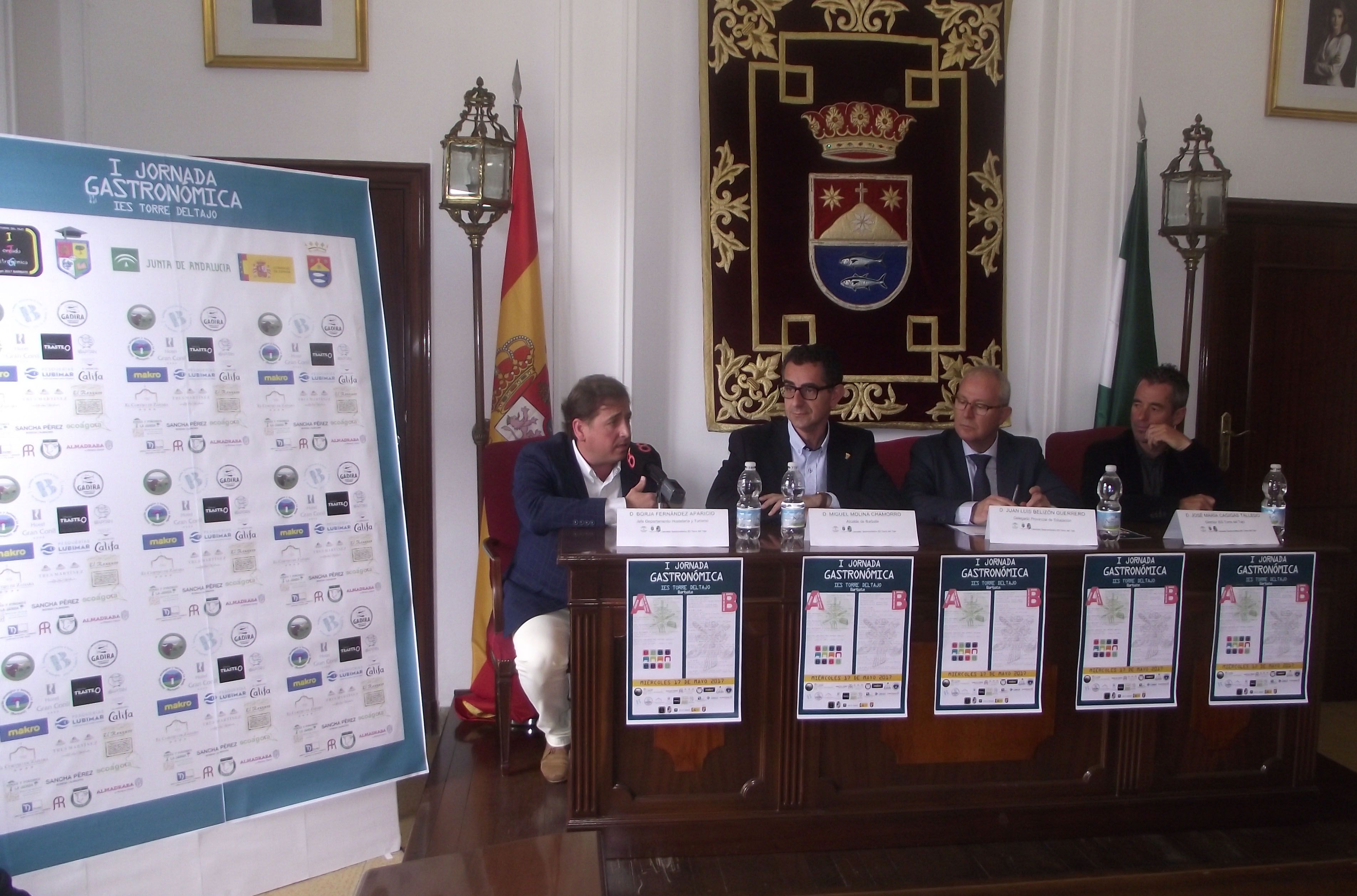 El IES Torre del Tajo da un salto de calidad este miércoles, 17 de mayo, con la organización de la I Jornada Gastronómica por parte del Departamente de Hostelería y Turismo, y en la que colabora la Delagación de Educación del Ayuntamiento de Barbate. El evento fue presentado por el alcalde de Barbate, Miguel Molina, y el delegado territorial de Educación, Juan Luis Belizón; quienes estuvieron acompañados del director del centro, José Cagigas, y el jefe del Departamento de Hostelería y Turismo del mismo, Borja Fernández.