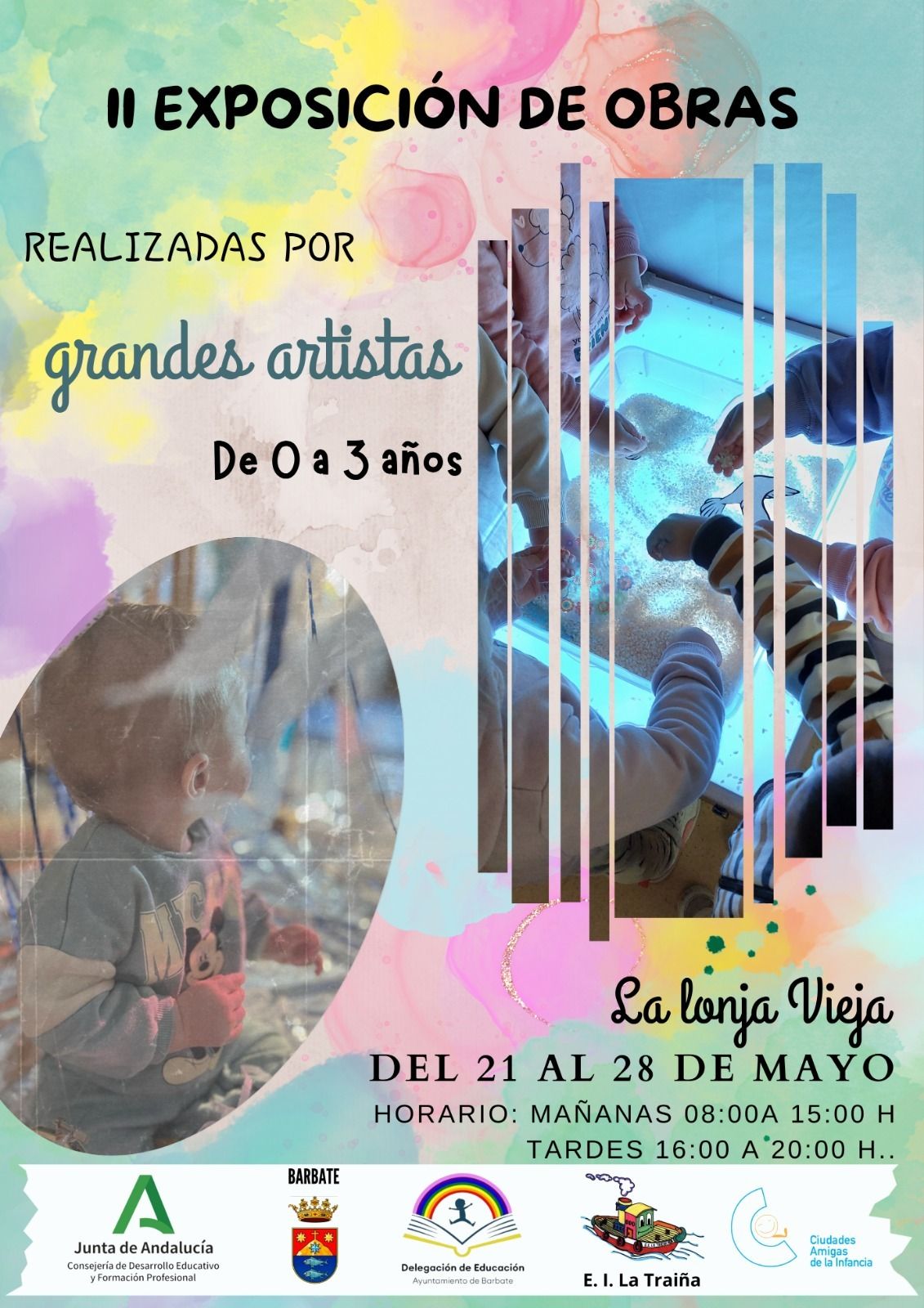 La Escuela Infantil La Traiña ha organizado, en colaboración con la Delegación de Educación del Ayuntamiento de Barbate, su segunda Exposición de Obras Artísticas, creadas por sus alumnos de 0 a 3 años. La inauguración ha tenido lugar hoy, martes 21 de mayo, a cargo de la delegada de Educación, Raquel Moral; la directora de Escuela Infantil La Traiña, Chani Muñoz; la inspectora de Educación, Isabel Armada; personal del equipo de Orientación Educativa de Atención Temprana; docentes y miembros del AMPA del centro infantil.